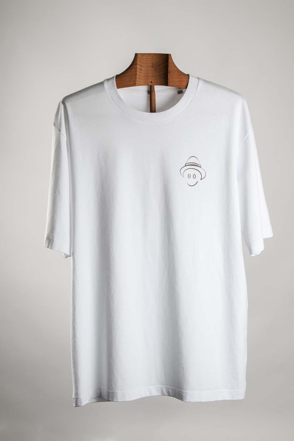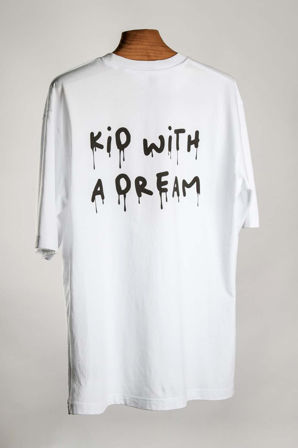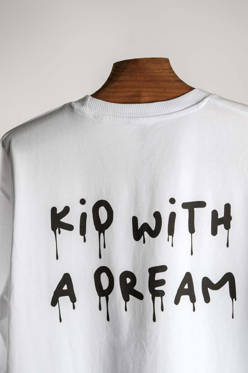 T-shirt branca com a frase “Kid with a dream”.
